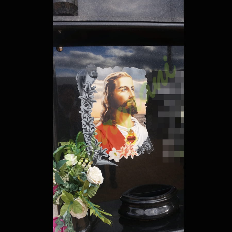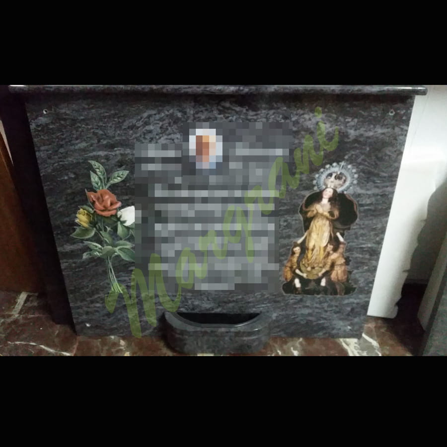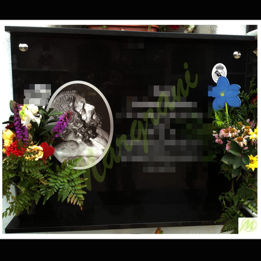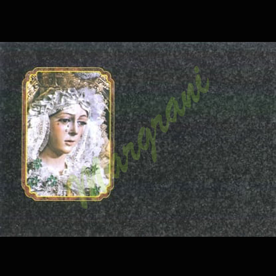 Se puede llevas a cabo a partir de cualquier fotografía con una calidad aceptable. El tamaño y forma del recorte es totalmente personalizable. Su proceso sofisticado de impresión y cocción de la pieza de porcelana dan como resultado una pieza de alta calidad, posteriormente esta pieza es incrustada en la placa de granito o mármol quedado todo al mismo nivel.