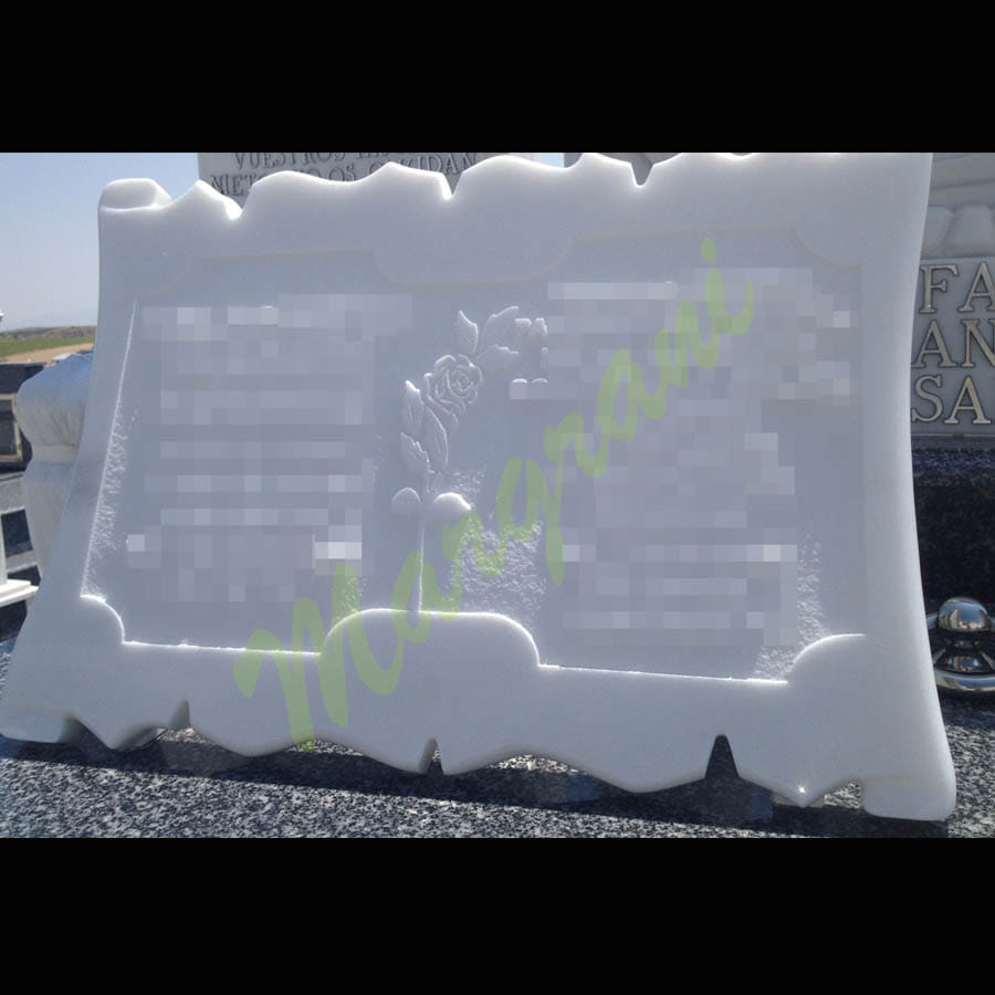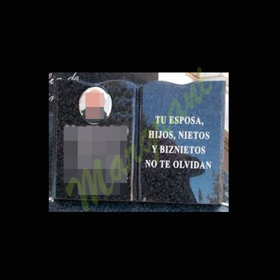 Estas placas libro de granito natural, se realizan en mármol o granito, están pensadas para colocar con una dedicatoria personalizada en los cementerios, en recuerdo de los seres queridos. Ideal para panteones y mausoleos. Se puede colocar de manera plana o sobre un soporte que le da una inclinación de 70 grados. En la piedra se graba el texto o motivos religiosos, a gusto del cliente.